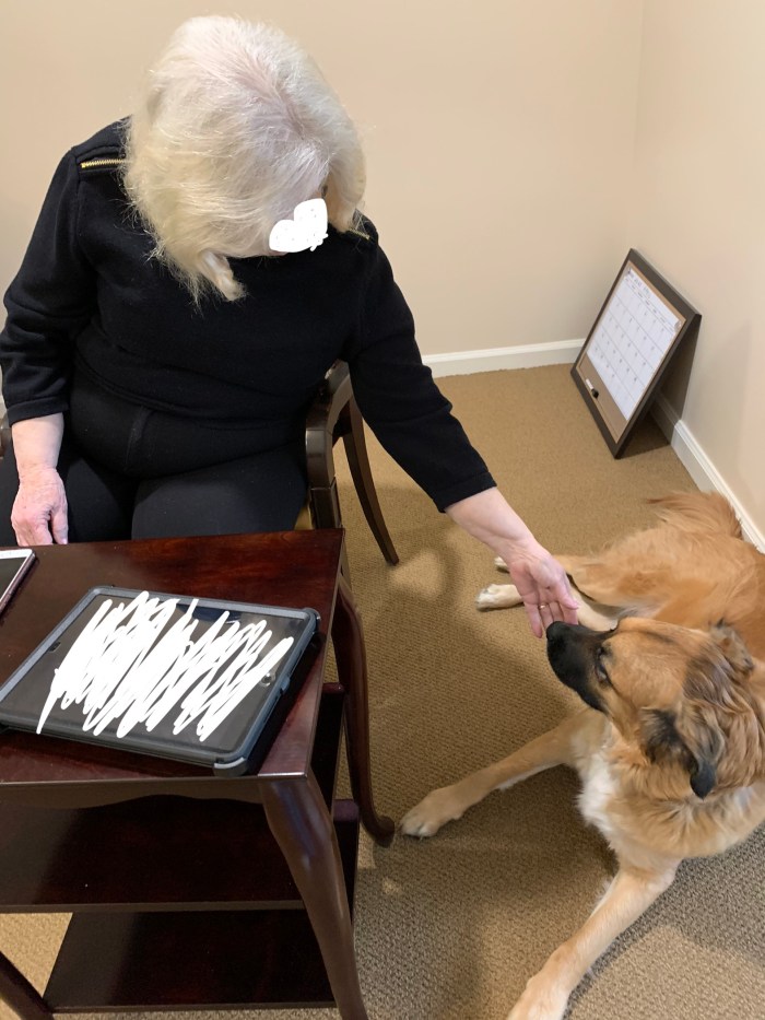 My loves were confined to their rooms for a sad, isolating, scary ~12 months. At first, I could see she was rattled by that: Where was everyone? What happened to the hustle & bustle, the dining room snacks, the endless affection? Why was everybody so on edge all of a sudden?! There was a shift from being center of attention to a lost pup, unsure of how to spend her time with her newly-masked coworkers. Eventually, though, she found a new purpose, perhaps even more crucial than the original: suite stops. Rosie made daily rounds to visit with, comfort, and cheer up our nonnos and nonnas when they could no longer come down to her.
