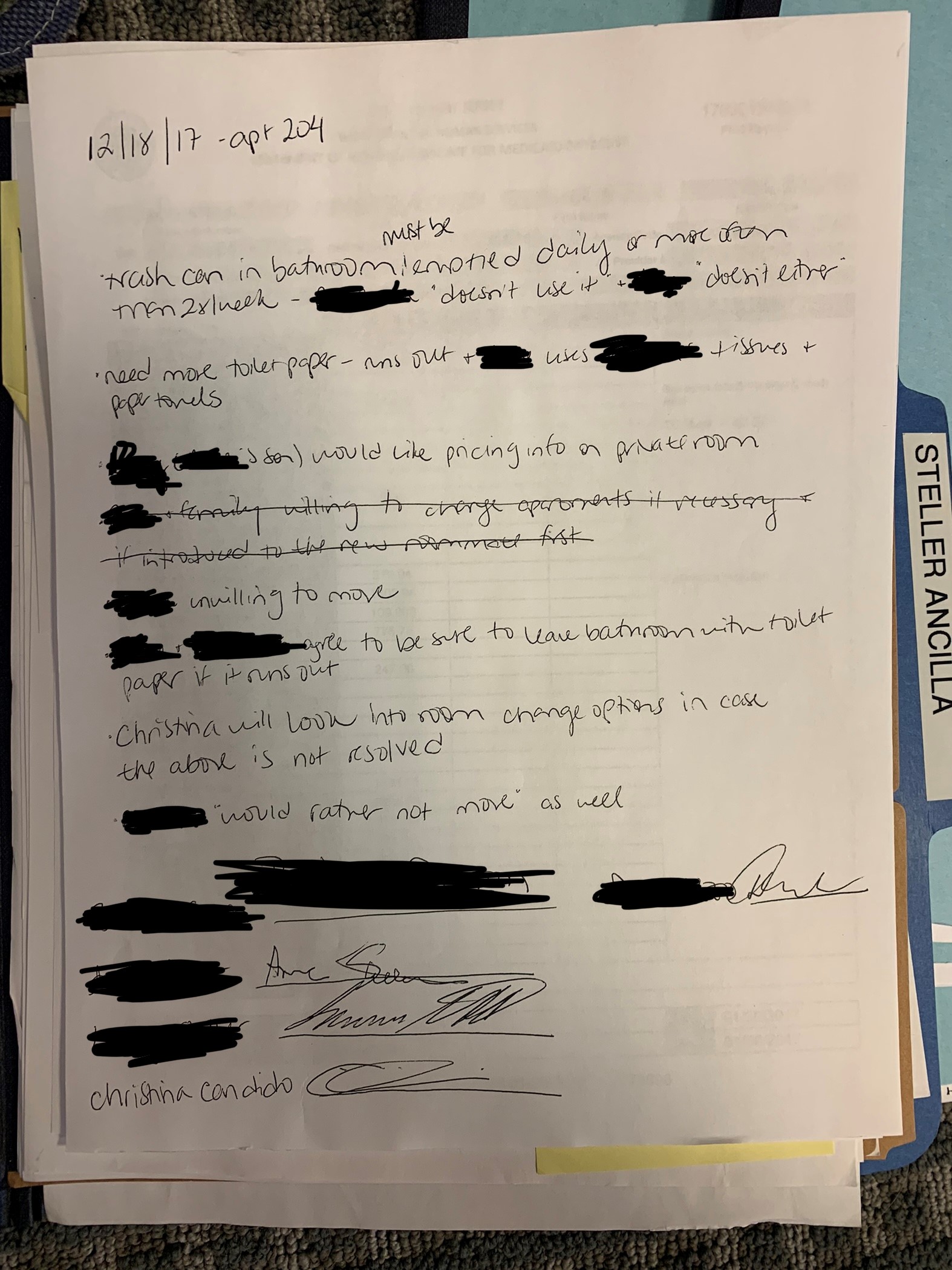 - Bickering with Roommates: It’s not easy living with someone at any age, whether they be a spouse, partner, family member, or nonrelated roomie. I would’ve imagined that with age comes more effective communication and, in turn, more mature, successful relationships and living arrangements. Not the case. I once had to draw up a contract for two roommates to sign and agree to (with witnesses!). Some terms included one nonna not using the other’s tissues, each agreeing to never leave the bathroom without TP, and both pitching in to help empty the trash. Neither were open to moving to a different apartment, yet they couldn’t stand one another. Official agreement can be found below. Spoiler alert: they parted ways.
